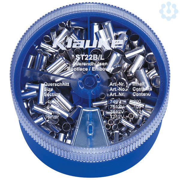 Streudose aus schlagfestem Kunststoff. Stapelbar und wiederverschließbar. Lieferumfang: Streudose (ST22L) 1 Stück, Aderendhülse DIN 46228 Teil 1, 4 mm², 9mm Länge, Cu verzinnt (749V) 200 Stück, Aderendhülse DIN 46228 Teil 1, 6 mm², 12mm Länge, Cu verzinnt (7512V) 100 Stück, Aderendhülse DIN 46228 Teil 1, 10 mm², 12mm Länge, Cu verzinnt (7612V) 70 Stück, Aderendhülse DIN 46228 Teil 1, 16 mm², 12mm Länge, Cu verzinnt (7712V) 70 Stück.