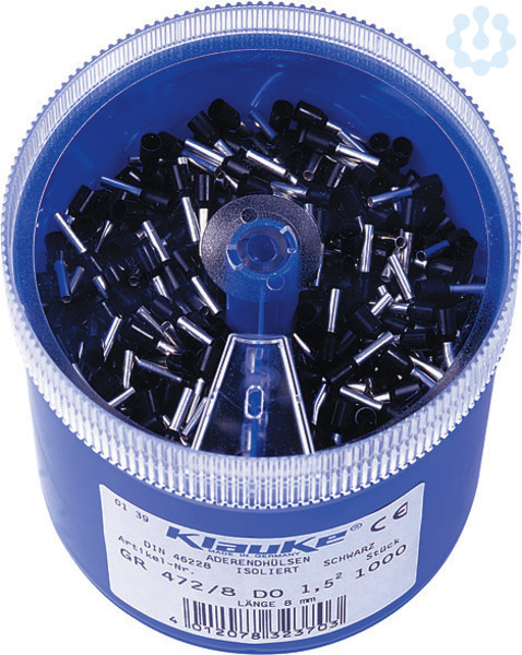 Streudose aus schlagfestem Kunststoff. Stapelbar und wiederverschließbar. Mit isolierten Aderendhülsen DIN 46228 Teil 4, 1,5 mm², 14mm Länge (4728) 1000 Stück.
