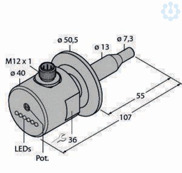 Strömungsüberwachung, Eintauchsensor mit integrierter Auswerteelektronik, Sensor für flüssige Medien, kalorimetrische Funktionsweise, Abgleich über Potentiometer, Anzeige via LED?Kette, DC 3?Draht, 19,2...28,8 VDC, Schließer, PNP?Ausgang, Steckergerät, M12 x 1, Sensor aus A4 (1.4404), Mech. Anschluss: Tri?Clamp