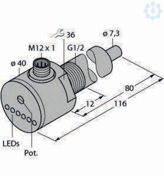 Strömungsüberwachung, Eintauchsensor mit integrierter Auswerteelektronik, Sensor für flüssige Medien, kalorimetrische Funktionsweise, Abgleich über Potentiometer, Anzeige via LED?Kette, DC 3?Draht, 19,2...28,8 VDC, Schließer, PNP?Ausgang, Steckergerät, M12 x 1, Sensorlänge 80 mm