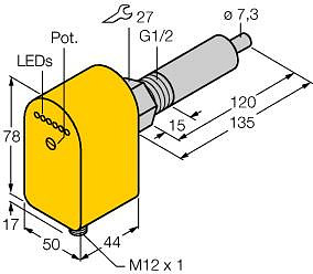 Strömungsüberwachung, Eintauchsensor mit integrierter Auswerteelektronik, Sensor nur für Wasser, kalorimetrische Funktionsweise, Abgleich über Potentiometer, Anzeige via LED?Kette, DC 3?Draht, 21.6...26.4 VDC, 4...20 mA Analogausgang, Steckergerät, M12 x 1, Linearisierter Analogausgang, Sensorlänge 120 mm
