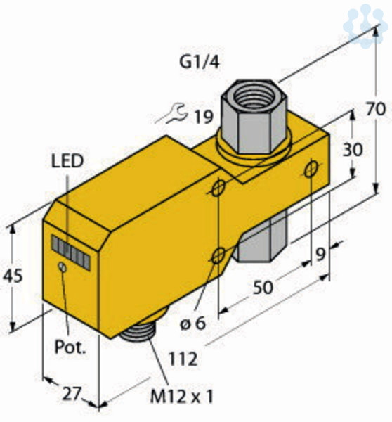 Strömungsüberwachung, Inline-Sensor mit integrierter Auswerteelektronik, Sensor für flüssige Medien, Kalorimetrische Funktionsweise, Abgleich über Potentiometer, Anzeige via LED?Kette, DC 4?Draht, 21.6...26.4 VDC, Schließer, Relaisausgang, Steckergerät, M12 x 1, Arbeitsbereich 0,02...3 l/min, Sensor aus Keramik/Kunststoff, Dichtung aus FKM