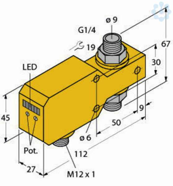 Strömungsüberwachung, Inline-Sensor mit integrierter Auswerteelektronik, Sensor für flüssige Medien, Kalorimetrische Funktionsweise, Abgleich über Potentiometer, Anzeige via LED?Kette, DC 3?Draht, 21.6...26.4 VDC, 4...20 mA Analogausgang, Steckergerät, M12 x 1, Arbeitsbereich 0,1...6 l/min