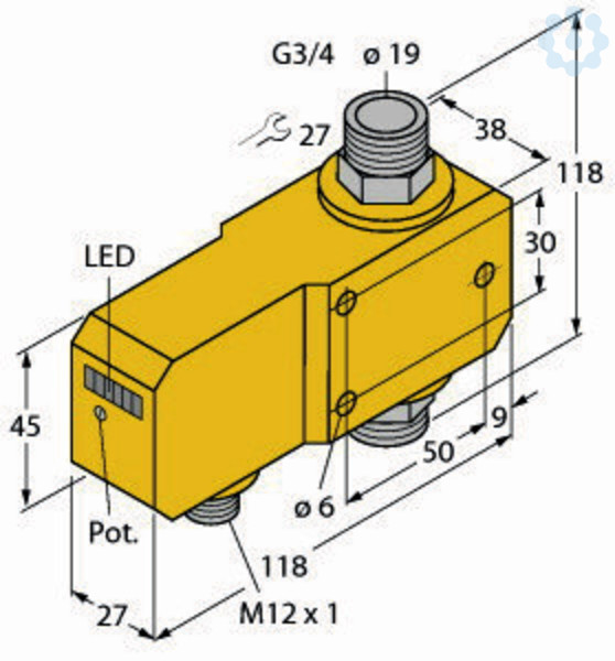 Strömungsüberwachung, Inline-Sensor mit integrierter Auswerteelektronik, Sensor für flüssige Medien, Kalorimetrische Funktionsweise, Abgleich über Potentiometer, Anzeige via LED?Kette, DC 3?Draht, 19,2...28,8 VDC, Schließer, PNP?Ausgang, Steckergerät, M12 x 1, Arbeitsbereich 4...30 l/min