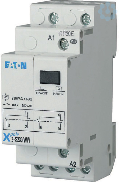 Stromstossschalter, Steuerspannung 230V 50Hz, Funktion: 2 Wechsler, Bemessungsstrom bei 250V AC nach IEC/EN 60669-2-2: 16A, Kappen-Einbaumaß 45mm, Einbaubreite 2TE (35mm), Hutschienenmontage, Klemmquerschnitt 0,5-10 qmm ein- und mehrdrähtig / 0,5-6 qmm feindrähtig mit Adernendhülse