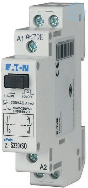 Stromstossschalter, Steuerspannung 240V 50Hz, Funktion: 1 Schliesser, Bemessungsstrom bei 250V AC nach IEC/EN 60669-2-2: 16A, Kappen-Einbaumaß 45mm, Einbaubreite 1TE (17,5mm), Hutschienenmontage, Klemmquerschnitt 0,5-10 qmm ein- und mehrdrähtig / 0,5-6 qmm feindrähtig mit Adernendhülse
