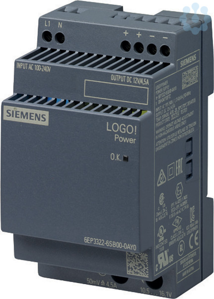 LOGO!POWER 12 V / 4,5 A Geregelte Stromversorgung Eingang: AC 100-240 V Ausgang: DC 12 V / 4,5 A Die Mini-Netzgeräte LOGO!Power im Design der LOGO!8-Module bieten viel Leistung auf kleinstem Raum. Der gute Wirkungsgrad über den gesamten Lastbereich und die geringe Verlustleistung im Leerlauf garantieren einen effizienten Betrieb. Der Weitbereichseingang für 1-phasige Netze und für Gleichspannungsnetze, sowie die Leistungsreserve beim Einschalten kapazitiver Lasten, erfüllen Anforderungen zahlreicher Applikationen. Einen universellen Einsatz ermöglichen auch der große Temperaturbereich und umfangreiche Zertifizierungen. Die zuverlässigen Stromversorgungen mit ihrem flachen stufenförmigen Gehäuse lassen sich höchst flexibel integrieren - beispielsweise in Installationsverteilern. Egal welche Branche, egal welche Anforderung ? Siemens bietet zuverlässige und effiziente Stromversorgungen für jede Anlage.