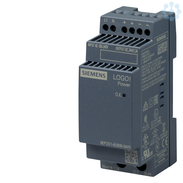 LOGO!POWER 24 V / 1,3 A Geregelte Stromversorgung Eingang: AC 100-240 V Ausgang: DC 24 V / 1,3 A Die Mini-Netzgeräte LOGO!Power im Design der LOGO!8-Module bieten viel Leistung auf kleinstem Raum. Der gute Wirkungsgrad über den gesamten Lastbereich und die geringe Verlustleistung im Leerlauf garantieren einen effizienten Betrieb. Der Weitbereichseingang für 1-phasige Netze und für Gleichspannungsnetze, sowie die Leistungsreserve beim Einschalten kapazitiver Lasten, erfüllen Anforderungen zahlreicher Applikationen. Einen universellen Einsatz ermöglichen auch der große Temperaturbereich und umfangreiche Zertifizierungen. Die zuverlässigen Stromversorgungen mit ihrem flachen stufenförmigen Gehäuse lassen sich höchst flexibel integrieren - beispielsweise in Installationsverteilern. Egal welche Branche, egal welche Anforderung ? Siemens bietet zuverlässige und effiziente Stromversorgungen für jede Anlage.