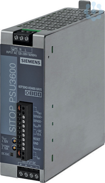 SITOP PSU3600 flexi Geregelte Stromversorgung Eingang: AC 120-230 V Ausgang: DC 3-52 V/10 A, 120 W Die 1-phasige Stromversorgung SITOP PSU3600 flexi verfügt über eine flexibel einstellbare Ausgangsspannung von 3 bis 52 V. Sie wird in allen Anwendungsbereichen eingesetzt, wo eine von 24 V abweichende Sonderspannung benötigt. Nicht nur der konventionelle Einsatz als Stromversorgung ist denkbar. Die Möglichkeit, die Ausgangsspannung auch dynamisch während des Betriebs verändern zu können, z.B. zur Drehzahlsteuerung von DC-Motroren/Lüftern oder zur Spannungsanpassung in Prüfständen, sowie zahlreiche Sonderfunktionen wie Sense-Leitung und Strommonitor eröffnen ein breites Feld an Einsatzmöglichkeiten. Egal welche Branche, egal welche Anforderung ? Siemens bietet zuverlässige und effiziente Stromversorgungen für jede Anlage.