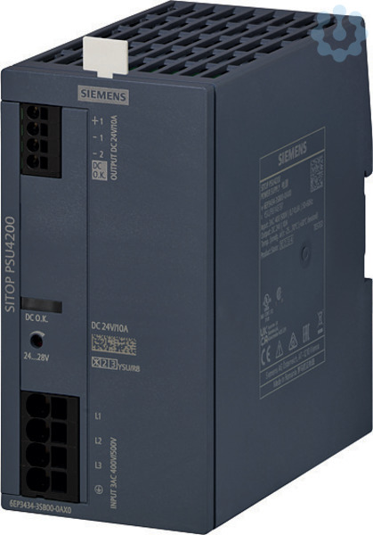 SITOP PSU4200 1AC 24 V/10 A Geregelte Stromversorgung PSU4200 Eingang: AC 120/240 V Ausgang: DC 24 V/10 A Die 1-phasigen Stromversorgungen SITOP PSU4200 sind für Basisanforderungen im industriellen Umfeld konzipiert und bieten alle wichtigen Funktionen zu einem günstigen Preis. Der Eingang mit automatischer Spannungsbereichsumschaltung ermöglicht den Anschluss an verschiedenste 1-phasige Versorgungsnetze. Durch die schmale Baubreite benötigen die Netzgeräte geringen Platzbedarf auf der Hutschiene und der gute Wirkungsgrad lässt wenig Verlustwärme im Schaltschrank entstehen. Zur weiteren Erhöhung der 24 V-Verfügbarkeit können die SITOP PSU4200 Netzteile mit Puffer-, Redundanz- und Selektivitätsmodulen kombiniert werden. Egal welche Branche, egal welche Anforderung - Siemens bietet zuverlässige und effiziente Stromversorgungen für jede Anlage.