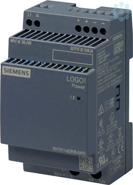 LOGO!POWER 5 V / 6,3 A Geregelte Stromversorgung Eingang: AC 100-240 V Ausgang: DC 5 V / 6,3 A Die Mini-Netzgeräte LOGO!Power im Design der LOGO!8-Module bieten viel Leistung auf kleinstem Raum. Der gute Wirkungsgrad über den gesamten Lastbereich und die geringe Verlustleistung im Leerlauf garantieren einen effizienten Betrieb. Der Weitbereichseingang für 1-phasige Netze und für Gleichspannungsnetze, sowie die Leistungsreserve beim Einschalten kapazitiver Lasten, erfüllen Anforderungen zahlreicher Applikationen. Einen universellen Einsatz ermöglichen auch der große Temperaturbereich und umfangreiche Zertifizierungen. Die zuverlässigen Stromversorgungen mit ihrem flachen stufenförmigen Gehäuse lassen sich höchst flexibel integrieren - beispielsweise in Installationsverteilern. Egal welche Branche, egal welche Anforderung ? Siemens bietet zuverlässige und effiziente Stromversorgungen für jede Anlage.