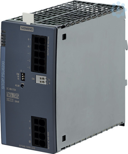 SITOP PSU6200 48 V/10 A Geregelte Stromversorgung Eingang: AC 400 - 500 V Ausgang: DC 48 V/10 A mit Diagnoseschnittstelle Die 3-phasigen SITOP PSU6200 sind Standard-Stromversorgungen für hohe technische Anforderungen. Sie eignen sich für vielfältige Anwendungen, vor allem im industriellen Umfeld wie zum Beispiel dem Serienmaschinenbau. Das wertige Design der PSU6200 Familie verbunden mit den Push-In-Klemmen steht für effektive Verdrahtung. Die lange Lebensdauer und die absolute Zuverlässigkeit machen die Module dieser Produktfamilie zu einem Allrounder. Der hohe Wirkungsgrad über den gesamten Lastbereich sowie minimale Leerlaufverluste garantieren einen ressourcenschonenden Energieverbrauch. Egal welche Branche, egal welche Anforderung ? Siemens bietet zuverlässige und effiziente Stromversorgungen für jede Anlage.