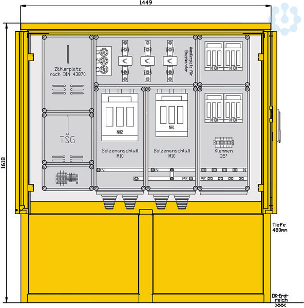 Gehäuse aus Edelstahl (Werkstoff 1.4301) mit Lackierung RAL 7032 -grau- mit Bodenflanschplatte und innenliegenden Bohrungen zur Befestigung mit Doppeltür und 3-Punkt-Stangenschloss sowie Schwenkhebel mit Profilhalbzylinder, Schließung G2123 sowie Kunststoff-Regenschutzkappe Einbauten bis einschl. RCD-Schutzschalter schutzisoliert vordere Blende zur Montage abnehmbar Kabelausführung bei geschlossener Tür möglich Schutzart: IP 44 Größe ca.: 1600 x 1440 x 480mm / H-B-T