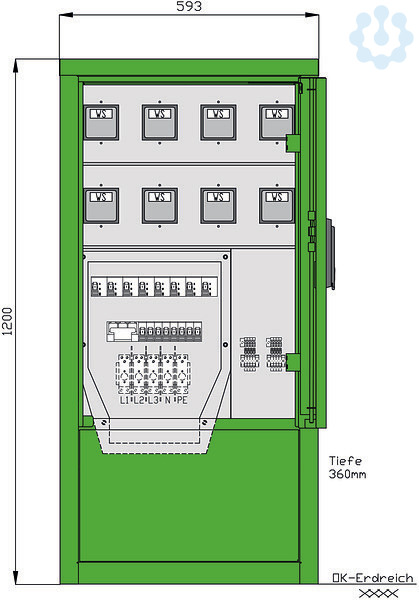 Gehäuse aus Edelstahl (Werkstoff 1.4301) mit Lackierung RAL 6017 -maigrün- mit Bodenflanschplatte und innenliegenden Bohrungen zur Befestigung mit Einfachtür und 3-Punkt-Stangenschloss sowie Schwenkhebel mit Profilhalbzylinder, Schließung G2123 sowie Kunststoff-Regenschutzkappe Einbauten bis einschl. RCD-Schutzschalter schutzisoliert vordere Blende zur Montage abnehmbar Kabelausführung bei geschlossener Tür möglich Schutzart: IP 44 Größe ca.: 1200 x 590 x 360mm / H-B-T