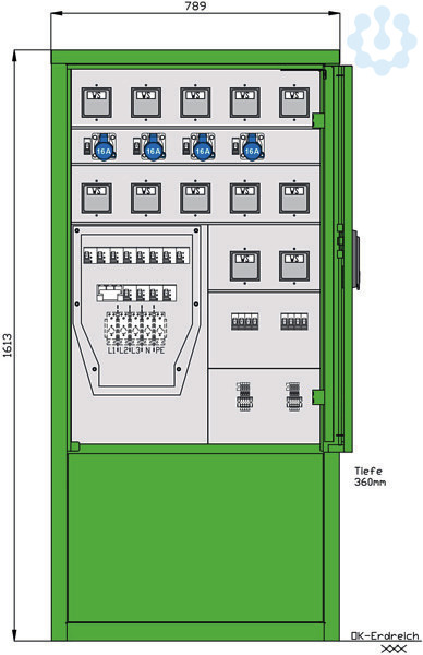 Gehäuse aus Edelstahl (Werkstoff 1.4301) mit Lackierung RAL 6017 -maigrün- mit Bodenflanschplatte und innenliegenden Bohrungen zur Befestigung mit Einfachtür und 3-Punkt-Stangenschloss sowie Schwenkhebel mit Profilhalbzylinder, Schließung G2123 sowie Kunststoff-Regenschutzkappe Einbauten bis einschl. RCD-Schutzschalter schutzisoliert vordere Blende zur Montage abnehmbar Kabelausführung bei geschlossener Tür möglich Schutzart: IP 44 Größe ca.: 1600 x 785 x 360mm / H-B-T