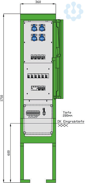 Gehäuse aus GFK mit Lackierung RAL 7035 -grau- mit Einfachtür und 3-Punkt-Stangenschloss sowie Schwenkhebel mit Profilhalbzylinder, Schließung G2123 sowie Kunststoff-Regenschutzkappe Einbauten bis einschl. RCD-Schutzschalter schutzisoliert Kabelausführung bei geschlossener Tür möglich Schutzart: IP 44 Größe ca.: 1110 x 360 x 280mm / H-B-T mit angepresstem Eingrabsockel 600mm Hoch