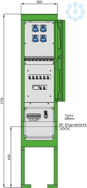 Gehäuse aus GFK mit Lackierung RAL 7035 -grau- mit Einfachtür und 3-Punkt-Stangenschloss sowie Schwenkhebel mit Profilhalbzylinder, Schließung G2123 sowie Kunststoff-Regenschutzkappe Einbauten bis einschl. RCD-Schutzschalter schutzisoliert Kabelausführung bei geschlossener Tür möglich Schutzart: IP 44 Größe ca.: 1110 x 360 x 280mm / H-B-T mit angepresstem Eingrabsockel 600mm Hoch