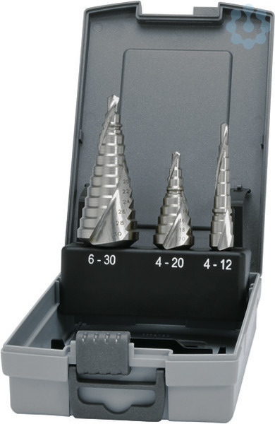 Höhere Standzeiten. Geringer Kraftaufwand. Bessere Schneidleistung. Ruhigeres Arbeiten. Geringere Gratbildung, Bohrbereich von 4 - 30 mm. Zum Aufreiben von Blechen, Rohren, NE Metallen und Kunststoff, Kwik Stepper Stufenbohrersatz in Stahlblechkassette.