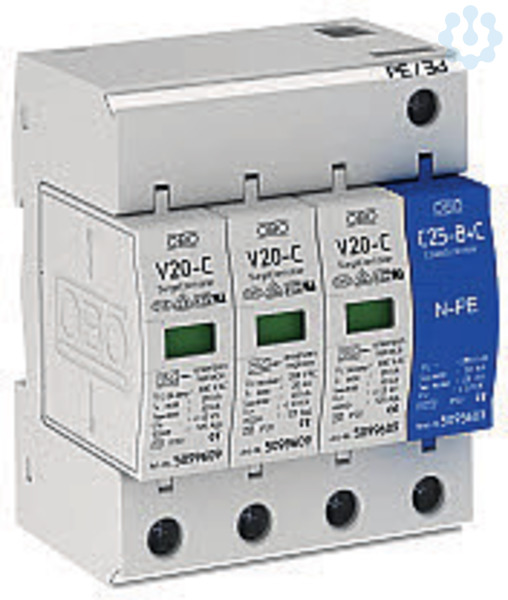 Überspannungsableiter V20-C Typ 2 nach EN 61643-11 (Klasse C nach VDE 0675), 3-polig für TN-C- bzw. 4-polig (3+NPE) für TN-S und TT-Netze. Anschlussfertiger Ableiter, steckbare Kompletteinheit mit thermischer und dynamischer Abtrennvorrichtung und optischer Funktionsanzeige. Multibase-Unterteil mit Doppelklemmen für Leiter und Kammschiene. Version -FS mit integriertem potentialfreiem Fernmeldekontakt. Schutzpegel < 1,4 kV, max. erforderliche Vorsicherung 125 A. Gekapselte, nicht ausblasende Varistorableiter bzw. Funkenstrecke. 5 Jahre Gewährleistung