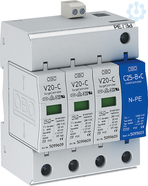 Überspannungsableiter der Anforderungsklasse Typ 2 nach EN 61643-11, universell für alle Netzformen. Ableiter, steckbar mit thermischer und dynamischer Abtrennvorrichtung. Optische Funktionsanzeige. FS = potentialfreier Fernsignalisierungskontakt Schutzpegel < 1,4 kV max. erforderliche Vorsicherung 125 A. Gekapselte, nicht ausblasende Zinkoxid-Varistorableiter bzw. Funkenstrecke. 5 Jahre Gewährleistung. VDE-Prüfzeichen
