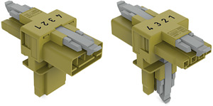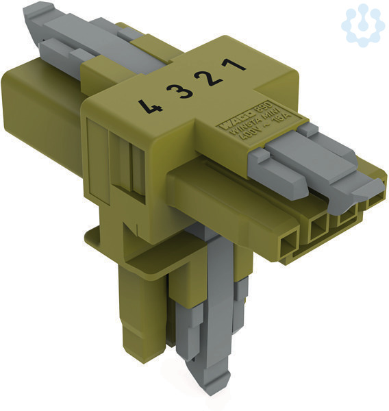 T-Verteiler. 4-polig. Kod. B. 1 Eingang. 2 Ausgänge. 3 Verriegelungsklinken. für fliegende Verbindungen. hellgrün