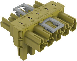 T-Verteiler. 5-polig. Kod. B. 1 Eingang. 2 Ausgänge. 3 Verriegelungsklinken. für fliegende Verbindungen. hellgrün