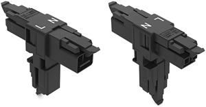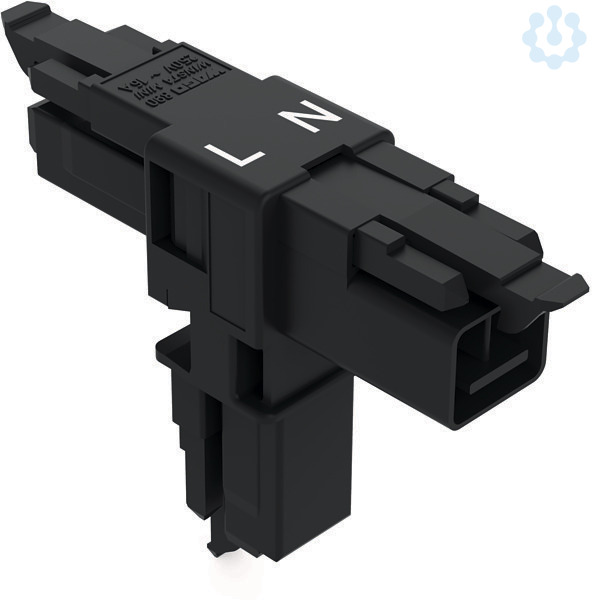 T-Verteiler. 2-polig. Kod. A. 1 Eingang. 2 Ausgänge. 3 Verriegelungsklinken. für fliegende Verbindungen. schwarz