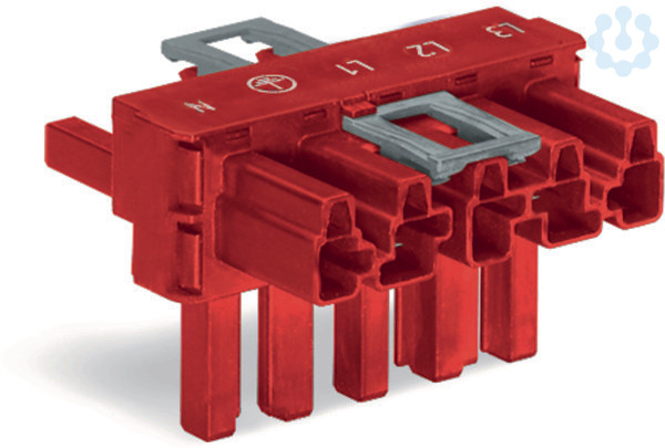 T-Verteiler. 5-polig. Kod. P. 1 Eingang. 2 Ausgänge. beidseitige Abgänge. 3 Verriegelungsklinken. für fliegende Verbindungen. rot