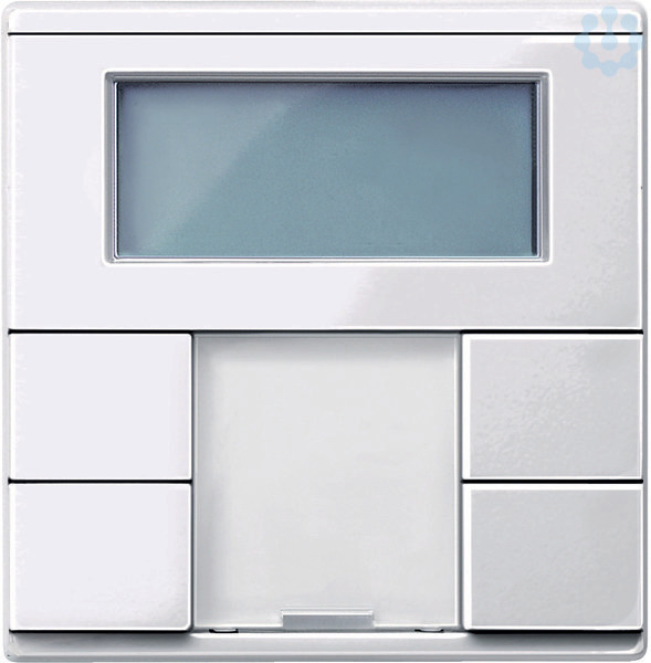 Tastsensor 2fach plus mit Raumtemperaturregler. Für System M. Komfortable Bedieneinheit mit 4 Bedientasten, Betriebs- und Statusanzeige und Beschriftungsfeld. Die Betriebsanzeige kann auch als Orientierungslicht verwendet werden. Mit Raumtemperaturregler und Display. Mit 5 roten LEDs. Der Raumtemperaturregler kann zum Heizen und Kühlen mit stufenlos einstellbaren KNX-Ventilantrieben oder zur Ansteuerung von Schaltaktoren und Heizungsaktoren verwendet werden. Mit dem weiß hinterleuchteten Display zur Anzeige von z.B. Uhrzeit, Datum, Temperatur und Betriebsart. Menü zur Einstellung von Standardbetriebsarten, Sollwert, Arbeits-/Nichtarbeitstag (externer Trigger), Anzeigemodus, Uhrzeit, Schaltzeiten und Helligkeit des Displays. Die Taster sind als Tasterpaare (Zweiflächen) oder als Einzeltaster frei parametrierbar. Mit integriertem Busankoppler. Der Busanschluss erfolgt über eine Busanschlussklemme. Funktionen der Drucktasten: Schalten, Umschalten, Dimmen, Jalousiesteuerung (relativ oder absolut), Impulsflanken l