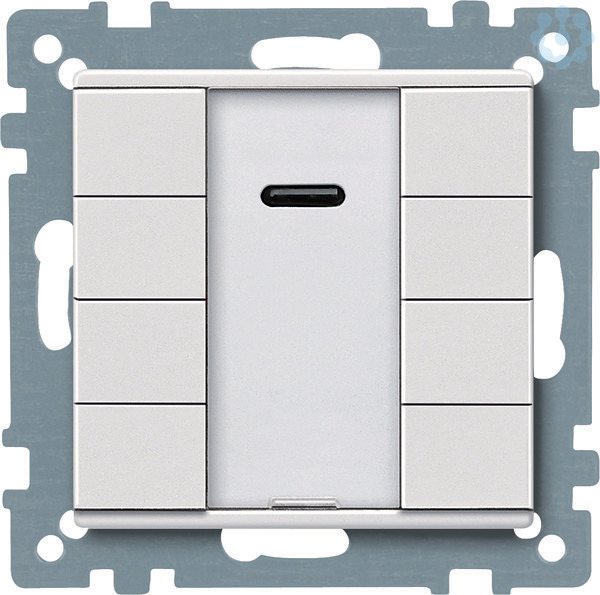 Im Design System M. Mit integriertem Busankoppler. Taster mit 8 Bedientasten, Betriebs-, Statusanzeige und Schriftfeld. Die Betriebsanzeige kann auch als Orientierungslicht verwendet werden. Die jeweiligen Funktionen der Tasten können mit einer IR-Fernbedienung angesteuert werden. Die Steuerung mit einer Merten Distance-IR-Fernbedienung ist bereits im Taster vorprogrammiert. Viele andere IR-Fernbedienungen (z. B. vorhandene TV- oder CD-Player-Fernbedienung) können am Taster angelernt werden. Das Gerät wird über eine Busanschlussklemme mit der Busleitung verbunden. Softwarefunktionen KNX: Schalten, Umschalten, Dimmen (ein-/zweiflächig), Jalousie (ein-/zweiflächig), Flanken löst 1,- 2-, 4- oder 8-Bit-Telegramme aus (Unterscheidung kurze/lange Betätigung). Flanken mit 2-Byte-Telegrammen (Unterscheidung kurze/lange Betätigung). 8-Bit-Schieberegler, Szenenabruf, Szenenspeicherung, Sperrfunktionen. Zubehör: Beschriftungsbogen für Multifunktions-Taster mit IR-Empfänger 6184xx.Lieferumfang: Mit Putzschutzhaube. Mit B