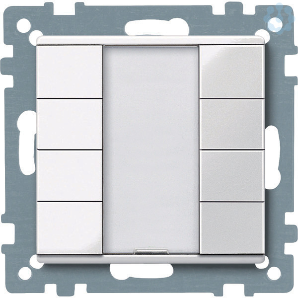 Im Design System M. Mit integriertem Busankoppler. Taster mit 8 Bedientasten, Betriebs-, Statusanzeige und Schriftfeld. Die Betriebsanzeige kann auch als Orientierungslicht verwendet werden. Das Gerät wird über eine Busanschlussklemme mit der Busleitung verbunden. Softwarefunktionen KNX Schalten, Umschalten, Dimmen (ein-/zweiflächig), Jalousie (ein-/zweiflächig). Flanken löst 1,- 2-, 4- oder 8-Bit-Telegramme aus (Unterscheidung kurze/lange Betätigung). Flanken mit 2-Byte-Telegrammen (Unterscheidung kurze/lange Betätigung), 8-Bit-Schieberegler, Szenenabruf, Szenenspeicherung, Sperrfunktionen. Zubehör Beschriftungsbogen für Taster 6183xx Lieferumfang Mit Putzschutzhaube. Mit Busanschlussklemme. Material Thermoplast brillant. Farbe polarweiß glänzend.