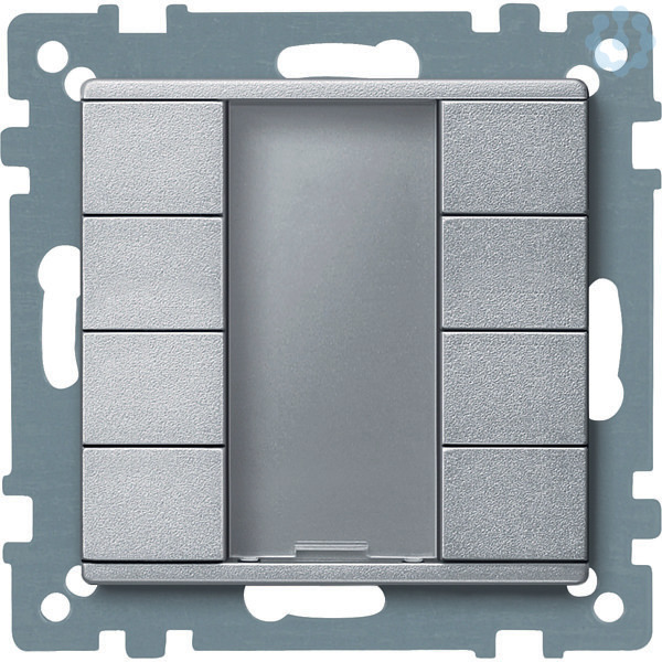 Im Design System M. Mit integriertem Busankoppler. Taster mit 8 Bedientasten, Betriebs-, Statusanzeige und Schriftfeld. Die Betriebsanzeige kann auch als Orientierungslicht verwendet werden. Das Gerät wird über eine Busanschlussklemme mit der Busleitung verbunden. Softwarefunktionen KNX Schalten, Umschalten, Dimmen (ein-/zweiflächig), Jalousie (ein-/zweiflächig). Flanken löst 1,- 2-, 4- oder 8-Bit-Telegramme aus (Unterscheidung kurze/lange Betätigung). Flanken mit 2-Byte-Telegrammen (Unterscheidung kurze/lange Betätigung), 8-Bit-Schieberegler, Szenenabruf, Szenenspeicherung, Sperrfunktionen. Zubehör Beschriftungsbogen für Taster MTN6183xx Lieferumfang Mit Putzschutzhaube. Mit Busanschlussklemme. Material Thermoplast edelmatt. Farbe aluminium.
