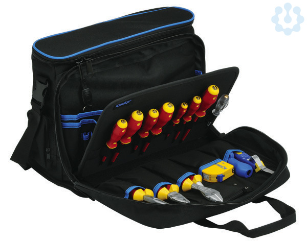 Techniker Grundausstattung, überwiegend bestückt mit VDE-Werkzeugen. Techniker Notebook Werkzeugtasche, Material: hochstrapazierfähiges Nylon. 90° aufklappbare Vordertasche. Hochwertige Reissverschlüsse. Spritzwassergeschützter Boden. Seitlich je eine Tasche mit Reissverschluss. Verstellbarer Tragegurt mit Schnellverschluss und Schulterauflage. Doppelter fixierbarar Tragegriff. Einschub für Visitenkarten. Lieferumfang: Techniker-Profitasche, leer (KL905L), VDE-Phillips-Schraubendreher, PH1 (KL110PH1IS), VDE-Phillips-Schraubendreher, PH2 (KL110PH2IS), VDE-Schlitz-Schraubendreher, 2,5 x 0,4 mm (KL1007525IS), VDE-Schlitz-Schraubendreher, 4,0 x 0,8 mm (KL10010040IS), VDE-Schlitz-Schraubendreher, 5,5 x 1,0 mm (KL10012555IS), Phasenprüfer mit Kraftformheft, einpolig, VDE 0680 150V - 250V (KL19073IS), VDE-Plus/Minus-Schraubendreher, Z1 (KL130PM1IS), VDE-Plus/Minus-Schraubendreher, Z2 (KL130PM2IS), Kabelmesser, mit Hakenklinge (KL745HK), VDE-Telefonzange, gerade, 205 mm (KL050205IS), VDE-Kraftseitenschneider (KL04420