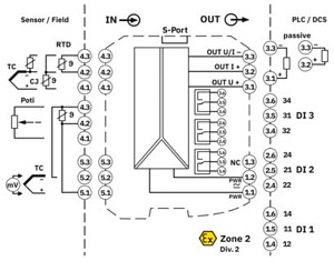 Frei programmierbarer Temperaturmessumformer mit analogem Ausgang und 3 Grenzwertrelais, Standardkonfiguration, Widerstandsthermometer in 2-, 3-, oder 4-Leiter-Technik, Thermoelemente, galvanische Trennung, Weitbereichsversorgung, Push-in-Anschluss, SIL, PL.