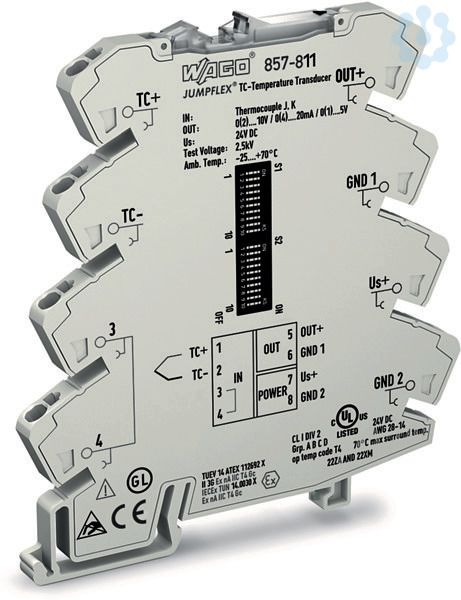 Temperaturmessumformer für Thermoelemente. Strom- und Spannungsausgangssignal. Konfiguration per Software. Versorgungsspannung DC 24 V. 6 mm Baubreite. lichtgrau