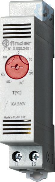 Thermostat zum Einbau im Schaltschrank, Reiheneinbaugerät für DIN-Schiene, 17,5 mm breit, mit variabler Schaltschwelle von -20 bis 40 Grad. 1 Öffner für 10 A, Kontaktmaterial AgNi, Bimetallsprungkontakt, roter Einstellknopf.