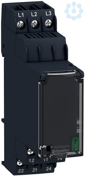 Zelio Control. Dieses Netzüberwachungsrelais überwacht Drehstromnetze (208-480 VAC) auf Phasenfolge und Phasenausfall. Zur Meldung sind zwei Relaiswechsler vorhanden, die bis 8 A belastbar ist. Der frontseitige Diagnoseschalter ermöglicht das Ausschalten der Ausgangsrelais zum Test der Gesamtanwendung. Mit dem Schließen der Klarsichtabdeckung wird der Diagnoseschalter automatisch zurückgesetzt. Zwei LEDs zeigt den Status an. Die Baubreite beträgt 22,5 mm und die Montage erfolgt auf der Hutschiene. Der Leitungsanschluss erfolgt über Schraubklemmen.