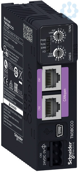TM3 Buskopplermodul für CANopen. Ermöglicht den Aufbau einer dezentralen Architektur mit TM3 E/A-Systeminseln über CANopen. Kompatibel mit SPS-Steuerungen der Familien Modicon M241, M251, M262. Jeder Buskoppler kann mit 7 lokalen + 7 Erweiterungsmodulen konfiguriert werden. 2 isolierte Ports mit RJ45 Buchse mit Daisy-chain Verkettung. Übertragungsrate 20 kbit/s?1 Mbit/s). 1 USB-B Port als Alternative für Firmwareupdates, Zugriff auf den Webserver und Konfigurationsparameter. Integrierter Webserver. QR-Code auf Frontseite mit Geräte-ID und Link zur technischen Dokumentation. IP20. Kompakte Abmessungen (B x H x T) 27 x 96.5 x 70 mm, zur Montage auf DIN-Schiene oder Schalttafel. Umgebungstemperatur im Betrieb -10?+60°C (horizontal). Zertifizierungen nach CE, cULus.