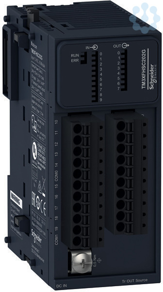 TM3 Hochgeschwindigkeitszählermodul für Modicon M262. Erweitert das Modicon M262 System um Hochgeschwindigkeitseingänge und -ausgänge in einer Erweiterungs- oder dezentralen Architektur. 10 Eingangskanäle als Sink oder Source mit 200 kHz Frequenz, 24 VDC Bemessungsspannung, 32 Bit Auflösung und ?3 µs Erfassungszeit nach Aufnahme. 8 Ausgangskanäle als Source mit ?10 µs Reaktionszeit auf Schwellwert. Integrierte E/A-Funktionen standard Digitaleingänge, Eingang mit Latch-option zur Impulserfassung. Eingangäge mit Ereigniserzeugung in der Modicon M262, Auf-/Abwärtszähler (32 Bit), Anwendungsspezifische Zähler, Periodenzähler, Frequenzmesser. Mit Schraubklemmenanschluss. IP20. Kompakte Abmessungen (B x H x T) 30.2 x 90 x 70 mm, zur Montage auf DIN-Schiene oder Schalttafel. Umgebungstemperatur im Betrieb -20?+60°C (horizontal). Zertifizierungen nach CE, UL, CSA.