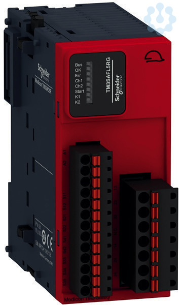 Erweiterungsmodule. TM3 integrierte Sicherheit, Not-Halt/Not-Aus/SLB CAT4, Federzugklemme. Abnehmbare Klemmenleisten mit Schraubklemmen oder Federklemmen, im Lieferumfang des TM3-Moduls enthalten. Verwendung für SPS Steuerung M221, M241 und M251.