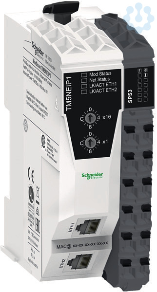 TM5 Buskopplermodul im Kit für Ethernet/IP und Modbus TCP. Beinhaltet jeweils einmal TM5ACBN1, TM5ACTB12PS, TM5NEIP1, TM5SPS3. Ermöglicht den Aufbau einer dezentralen Architektur mit TM5 E/A-Systeminseln über Ethernet/IP oder Modbus TCP. Kompatibel mit Modicon M262 und PacDrive Controllern. Jeder Buskoppler kann mit bis zu 64 Erweiterungsmodulen konfiguriert werden. 2 isolierte und geschaltete Ethernet Ports mit RJ45 Buchse die Daisy-chain oder Ringtopologie ermöglichen (10 Mbit/s / 100 Mbit/s). 1 USB-B Port als Alternative für Firmwareupdates, Zugriff auf den Webserver und Konfigurationsparameter. Integrierte Cybersecurtiy mit Achilles Zertifizierung und Verwaltung von Benutzerzugriffsrechten über integrierten Webserver. Integrierter Webserver. QR-Code auf Frontseite mit Geräte-ID und Link zur technischen Dokumentation. IP20. Kompakte Abmessungen (B x H x T) 26.8 x 93 x 73.3 mm, zur Montage auf DIN-Schiene oder Schalttafel. Umgebungstemperatur im Betrieb -20?+60°C (horizontal). Zertifizierungen nach CE, cULu