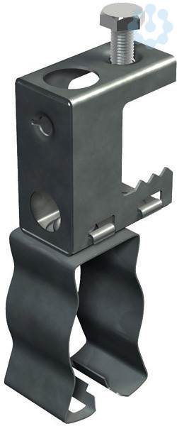 Trägerschraubklammer mit drehbarem Clip zur Aufnahme von Rohren und Kabeln. Die Aufnahme kann am unteren Ende verriegelt werden.