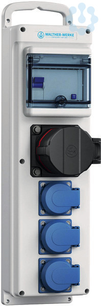 Abgänge/ Absicherung: 1 Fehlerstromschutzschalter (RCD) 4P 40A/30mA -A- 1 NEO CEE Anbaudose gerade 16A 5P 400V 6h 3 Schutzkontaktsteckdosen 16A 3P 230V
