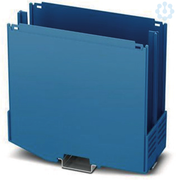 Tragschienengehäuse, Gehäuseunterteil mit Metallfußriegel, Etage 1: mit Lüftungsschlitzen, Breite: 50,1 mm, Höhe: 122,5 mm, Tiefe: 108,35 mm, Farbe: blau (5015), Querverbindung: Tragschienen-Busverbinder (optional), Polzahl Querverbinder: 8