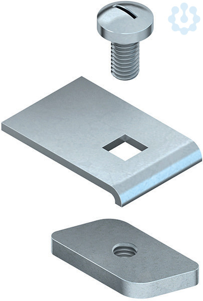 Trennstegbefestigungsklemme, zur Befestigung von Trennstegen in der trapezförmigen Quersicke der Weitspannkabelrinnen, auf Weitspannkabelleitern mit Sprossen von 16 mm Schlitzweite und auf Steigetrassen STL 60... mit Sprossen von 16 mm Schlitzweite, einschließlich Gleitmutter GSM 406 E5 und Flachkopfschraube mit Schlitz FK 6X10 E5 aus Edelstahl. An jeder Stelle im Profilschlitz einsetzbar.