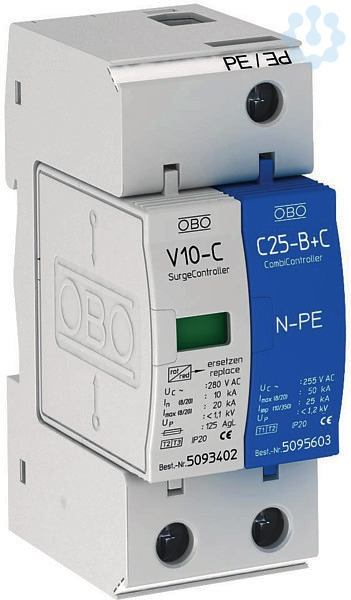 Überspannungsableiter Typ 2+3 - Kompletteinheit, bestehend aus Ober- und Unterteil, vormontiert und anschlussfertig - geeignet für TN-S und TT-Netz-Systeme - Inkl. thermischer und dynamischer Abtrennvorrichtung - Mit optischer Defektanzeige - Hohe Stromleitfähigkeit bei langer Lebensdauer - Gekennzeichnete Anschlüsse Anwendungsbeispiel: Wohngebäude, Einfamilienhaus