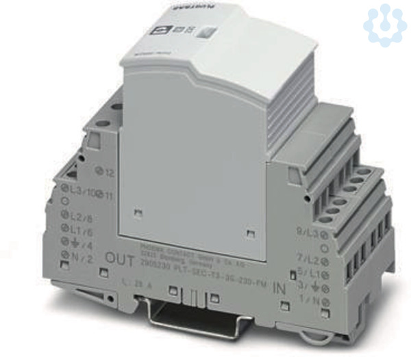 Steckbarer Geräteschutz, gem. Typ 3 / Class III, für 3-phasige Stromversorgungsnetze mit separatem N und PE (5-Leitersystem: L1, L2, L3, N, PE), mit integrierter stoßstromfester Sicherung und Fernmeldekontakt.