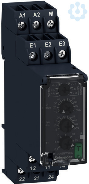 Zelio Control. Dieses Spannungsüberwachungsrelais überwacht einen Messkreis auf Über- oder Unterschreitung des eingestellten Grenzwertes (1-100 VAC/DC). Dabei kann zwischen Überschreitung, Unterschreitung und Über- und Unterschreitung im Fenstermodus gewählt werden. Optional ist ein Fehlerspeicher wählbar, der bis zu einem Reset die Fehlermeldung hält. Zur Meldung sind zwei Relaiswechsler vorhanden, die bis 8 A belastbar sind. Die Arbeitsweise, der Grenzwert, die Schalthysterese und eine Abfallverzögerung sind einstellbar. Die Einstellungen erfolgen über Bedienelemente in der Front, die unter einer Klarsichtabdeckung gegen Veränderungen geschützt werden können. Mit einem beleuchteten Skalenpfeil läßt sich die Einstellung der Potentiometer sehr deutlich auch aus der Entfernung erkennen. Der frontseitige Diagnoseschalter ermöglicht das Ausschalten der Ausgangsrelais zum Test der Gesamtanwendung. Mit dem Schließen der Klarsichtabdeckung wird der Diagnoseschalter automatisch zurückgesetzt. Das Weitspannungsnetzte