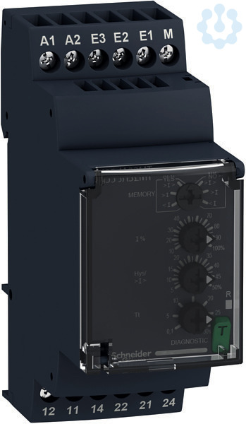 Zelio Control. Dieses Stromüberwachungsrelais überwacht einen Leiter auf Über- oder Unterschreitung des eingestellten Grenzwertes (1,5-15 A). Dabei kann zwischen Überschreitung, Unterschreitung und Über- und Unterschreitung im Fenstermodus gewählt werden. Optional ist ein Fehlerspeicher wählbar, der bis zu einem Reset die Fehlermeldung hält. Zur Meldung sind zwei Relaiswechsler vorhanden, die bis 8 A belastbar sind. Die Arbeitsweise, der Grenzwert, die Schalthysterese und eine Abfallverzögerung sind einstellbar. Die Einstellungen erfolgen über Bedienelemente in der Front, die unter einer Klarsichtabdeckung gegen Veränderungen geschützt werden können. Mit einem beleuchteten Skalenpfeil läßt sich die Einstellung der Potentiometer sehr deutlich auch aus der Entfernung erkennen. Der frontseitige Diagnoseschalter ermöglicht das Ausschalten der Ausgangsrelais zum Test der Gesamtanwendung. Mit dem Schließen der Klarsichtabdeckung wird der Diagnoseschalter automatisch zurückgesetzt. Die Versorgungsspannung beträgt 38