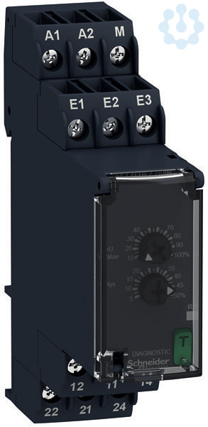 Zelio Control. Dieses Spannungsüberwachungsrelais überwacht eine Messkreis auf Überschreitung des eingestellten Grenzwertes (1-100 VAC/DC). Zur Meldung sind zwei Relaiswechsler vorhanden, die bis 8 A belastbar sind. Der Grenzwert und die Schalthysterese sind einstellbar. Die Einstellungen erfolgen über Bedienelemente in der Front, die unter einer Klarsichtabdeckung gegen Veränderungen geschützt werden können. Mit einem beleuchteten Skalenpfeil läßt sich die Einstellung der Potentiometer sehr deutlich auch aus der Entfernung erkennen. Der frontseitige Diagnoseschalter ermöglicht das Ausschalten der Ausgangsrelais zum Test der Gesamtanwendung. Mit dem Schließen der Klarsichtabdeckung wird der Diagnoseschalter automatisch zurückgesetzt. Das Weitspannungsnetzteil (24-240 VAC/DC) ermöglicht einen universellen Einsatz. Zwei LEDs zeigt den Status an. Die Baubreite beträgt 22,5 mm und die Montage erfolgt auf der Hutschiene. Der Leitungsanschluss erfolgt über Schraubklemmen.